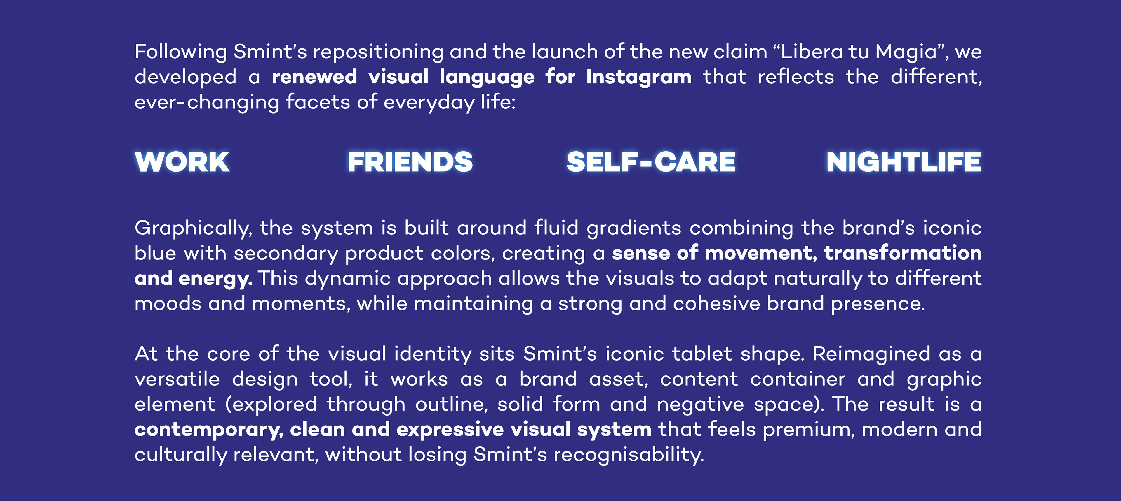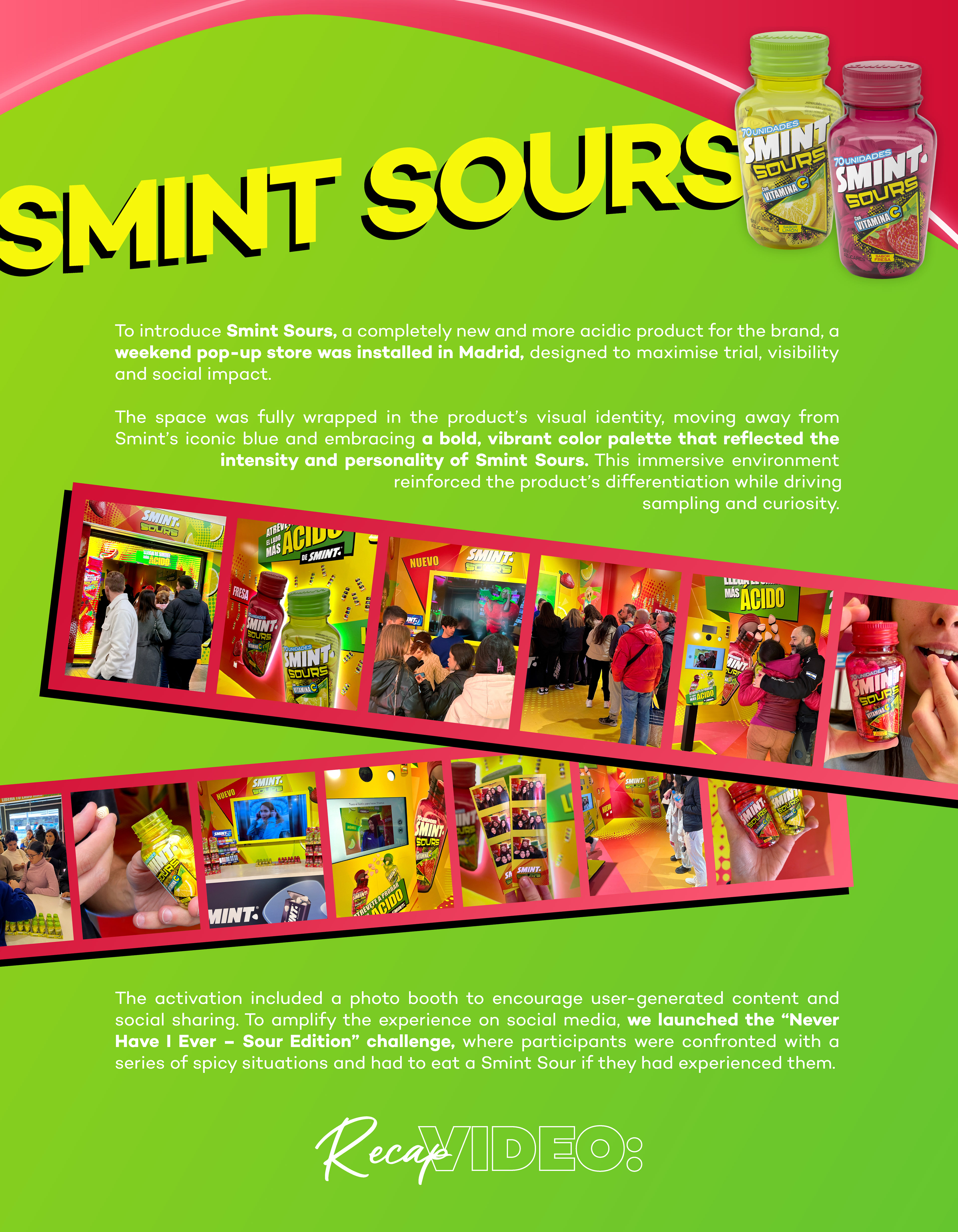 A selection of social media content and brand activations developed for Smint, part of Perfetti Van Melle. The project includes visual direction for Instagram, TikTok launch campaigns and experiential activations, translating Smint’s positioning into platform-native content and bold, contemporary visual systems designed to drive engagement and cultural relevance.